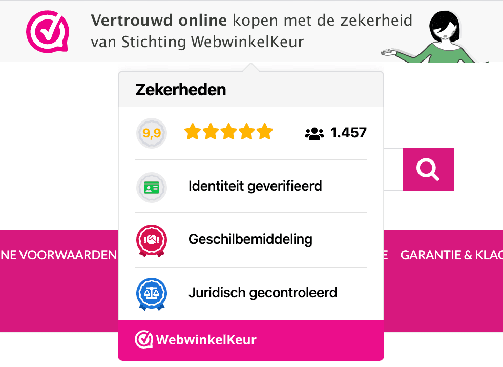 Een geldig keurmerk van WebwinkelKeur is daarnaast vaak klikbaar. Na het klikken komt er een pop-up naar voren waarin onder andere de zekerheden en badges & reviews te lezen zijn.