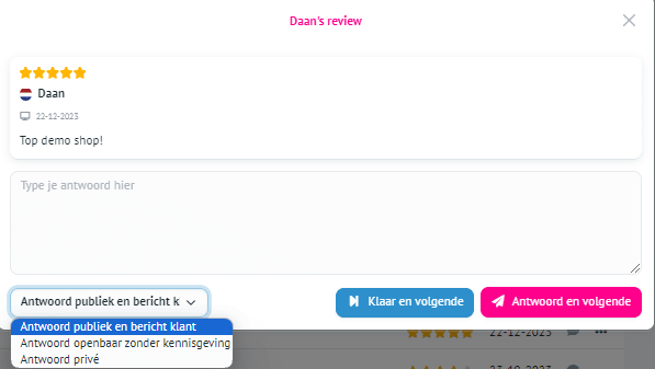 In deze pop-up kun je naast het lezen van ervaringen ook zelf jouw eigen ervaring met de webwinkel plaatsen, een eventuele klacht indienen over de webwinkel of naar de ledenpagina gaan.