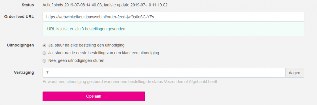 - Ga terug naar je WebwinkelKeur dashboard en plak deze link in het veld 'Order Feed URL'.