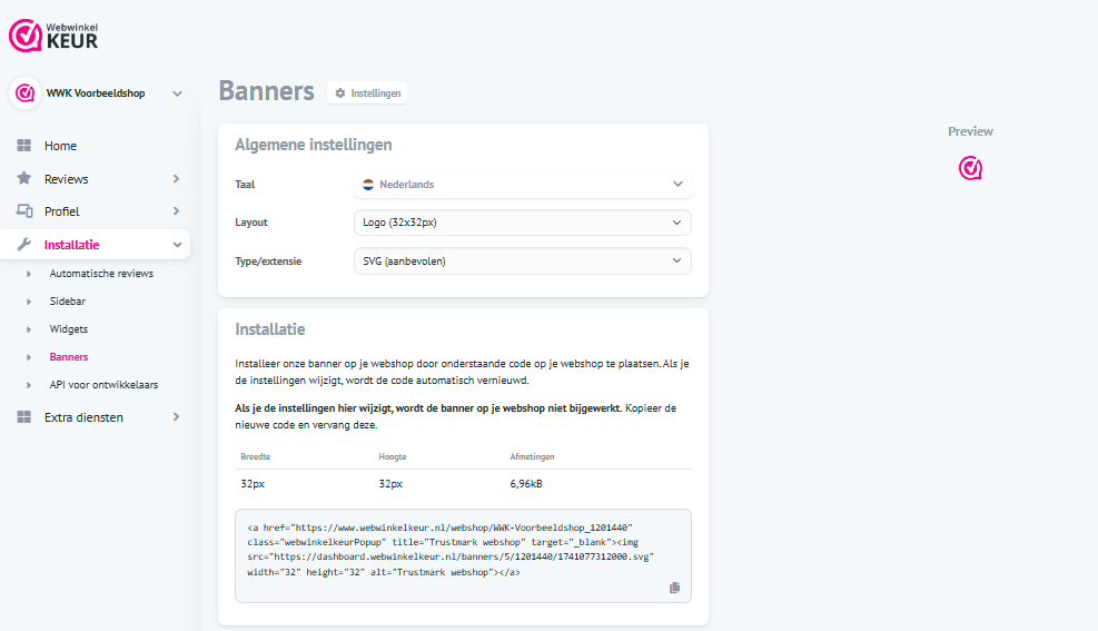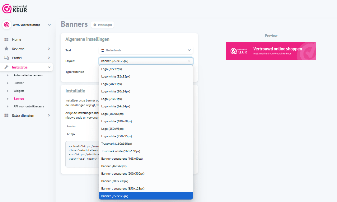 - Login binnen je WebwinkelKeur dashboard en ga naar 'Installatie' > 'Banners'.