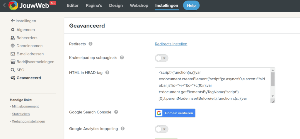 - Ga naar 'Instellingen' > 'Geavanceerd' en plak de code in het veld voor de HTML in de Head-tag.