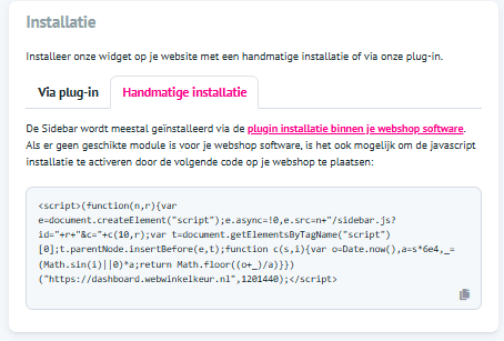 - Login binnen je WebwinkelKeur dashboard en ga naar 'Installatie' > 'Sidebar'.