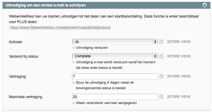 Maximale vertraging: dit voorkomt dat bestellingen die pas na lange tijd op 'complete' worden gezet alsnog een uitnodiging krijgen. Stel je dit in op 20, dan ontvangen alleen bestellingen die binnen 20 dagen na aankoop op 'complete' worden gezet een uitnodiging.