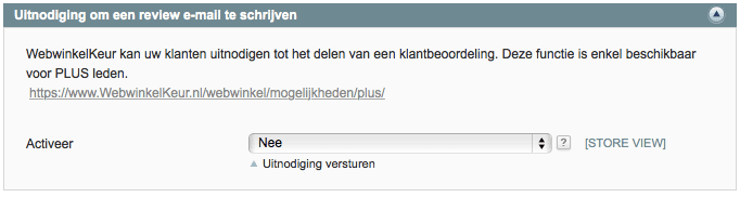 Verzend bij status: hiermee bepaal je bij welke bestelstatus de uitnodiging wordt verzonden. Kies je bijvoorbeeld 'complete', dan wordt de uitnodiging verzonden zodra je de bestelling in Magento op 'complete' zet.