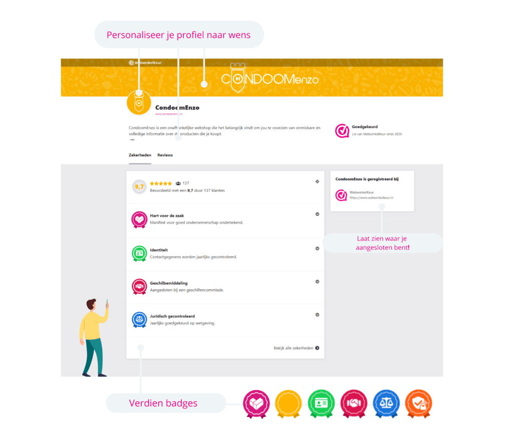 Zoals hierboven vermeld staat, krijgen leden van WebwinkelKeur een geheel eigen ledenpagina. Niet alleen verwijzen de uitingen die je op de webshop hebt staan naar deze pagina, ook Google navigeert de consument hiernaartoe. Wanneer de consument jouw webshopnaam googelt in combinatie met bijvoorbeeld betrouwbaarheid, reviews en/of keurmerk, komen ze op jouw persoonlijke pagina terecht. Deze pagina bevat onder andere reviews, bedrijfsgegevens en zekerheidsbadges. Door reviews te verzamelen, verschillende badges te verdienen en je pagina te personaliseren, onderscheid je je webshop nog meer van de rest! De URL van zo'n pagina kun je herkennen aan: https://www.webwinkelkeur.nl/webshop/[webshopnaam]_[getallen]. Een voorbeeld van een dergelijke ledenpagina kun je hier vinden