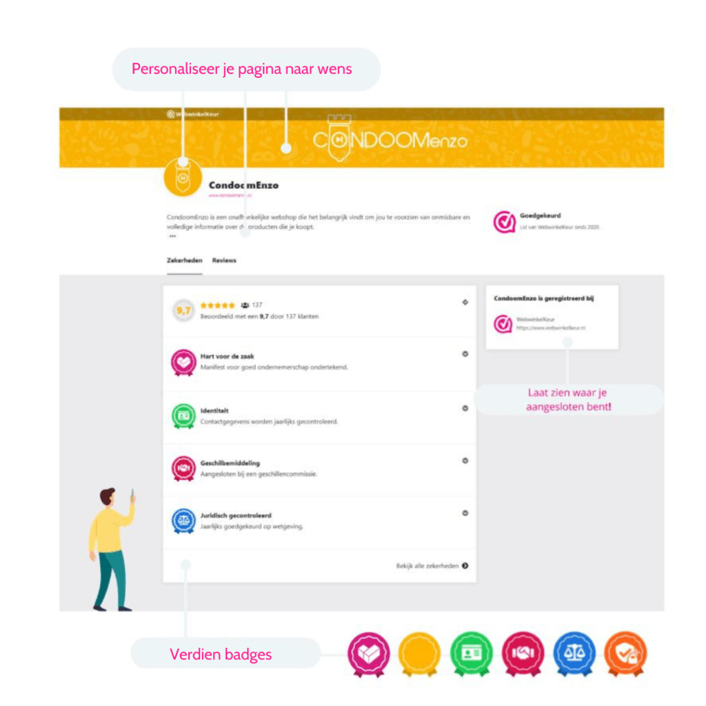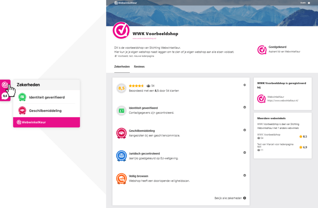 Zoals hierboven vermeld staat, krijgen leden van WebwinkelKeur een geheel eigen ledenpagina. Niet alleen verwijzen de uitingen die je op de webshop hebt staan naar deze pagina, ook Google navigeert de consument hiernaartoe. Wanneer de consument jouw webshopnaam googelt in combinatie met bijvoorbeeld betrouwbaarheid, reviews en/of keurmerk, komen ze op jouw persoonlijke pagina terecht. Deze pagina bevat onder andere reviews, bedrijfsgegevens en zekerheidsbadges. Door reviews te verzamelen, verschillende badges te verdienen en je pagina te personaliseren, onderscheid je je webshop nog meer van de rest! De URL van zo'n pagina kun je herkennen aan: https://www.webwinkelkeur.nl/webshop/[webshopnaam]_[getallen]. Een voorbeeld van een dergelijke ledenpagina kun je hier vinden