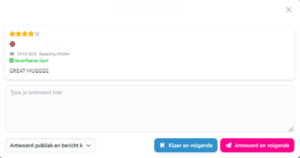 Ook op positieve klantbeoordelingen raden we altijd aan om te reageren, bijvoorbeeld door de klant te bedanken voor zijn beoordeling. Zo weet de beoordelaar dat je het waardeert dat hij een beoordeling achterlaat.