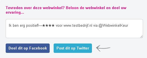 Heeft een klant een goede review over jou klaarstaan om te plaatsen? Dan mag (en wil jij!) de klant dit natuurlijk delen met dit netwerk van vrienden en kennissen. Vandaar dat je bij een PLUS- of PRO-pakket de mogelijkheid hebt om na het plaatsen van een positieve klantbeoordeling deze ook te verspreiden via Facebook & Twitter. Alleen bij een 4 of 5 sterren beoordeling wordt deze mogelijkheid voor consumenten geboden. Zo wordt positieve mond-tot-mond reclame van jouw webshop gestimuleerd!