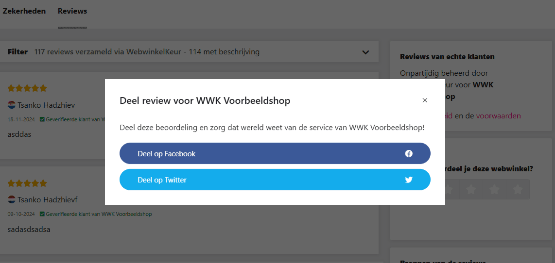Heeft een klant een goede review over jou klaarstaan om te plaatsen? Dan mag (en wil jij!) de klant dit natuurlijk delen met dit netwerk van vrienden en kennissen. Vandaar dat je bij een PLUS- of PRO-pakket de mogelijkheid hebt om na het plaatsen van een positieve klantbeoordeling deze ook te verspreiden via Facebook & Twitter. Alleen bij een 4 of 5 sterren beoordeling wordt deze mogelijkheid voor consumenten geboden. Zo wordt positieve mond-tot-mond reclame van jouw webshop gestimuleerd!