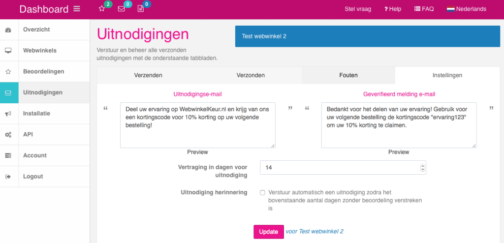 en vervolgens te kiezen voor de optie 'uitnodigingen' in het linker menu. Vervolgens ziet u op de beheerpagina als vierde kolom 'instellingen' staan. Hier kunt u uw eigen tekst invullen voor de uitnodigingen. Vermeld in deze tekst dat het plaatsen van een beoordeling beloont wordt met een kortingscode.