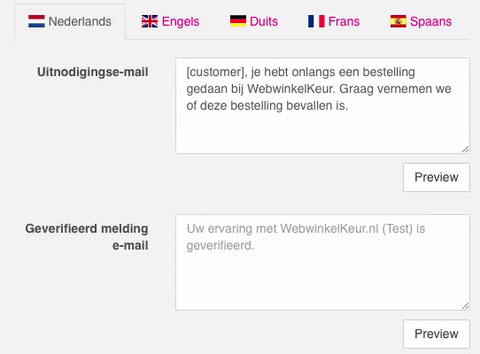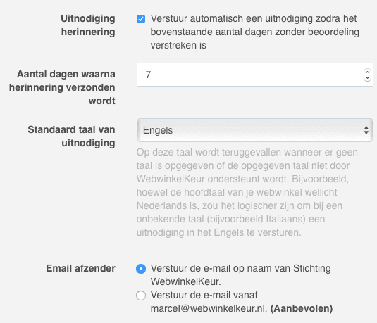 In het meertalige pakket worden uitnodigingen verzonden in de taal van jouw klant. Het kan echter voorkomen dat jouw klant uit een land komt waarvoor WebwinkelKeur nog geen ondersteuning biedt, bijvoorbeeld Italië. Vroeger werd bij een onbekende taal de uitnodiging voor het achterlaten van een beoordeling in de standaardtaal van de ledenpagina verzonden. Bij deze Italiaanse klant kon dit resulteren in een Nederlandse uitnodiging. We hebben dit opgelost door een aparte instelling te maken waarmee je de standaardtaal van de uitnodiging kunt kiezen. In veel gevallen zal het namelijk wenselijk zijn om niet terug te vallen op de standaardtaal van de ledenpagina, maar de uitnodiging in bijvoorbeeld het Engels te versturen wanneer een taal onbekend of onbeschikbaar is. [caption id="attachment_56150" align="aligncenter" width="535"]