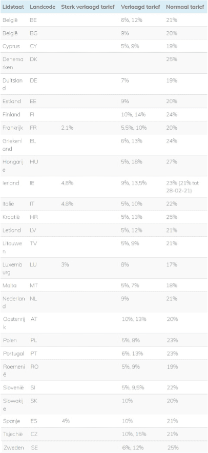 Vanaf 1 juli 2021 gelden er geen drempelbedragen meer per land. Wanneer je meer dan € 10.000 per jaar verkoopt over de grens aan consumenten moet je de BTW tarieven van het land van de afnemer hanteren. Dit drempelbedrag geldt niet per land, maar voor het totaalbedrag van internationale verkopen binnen de EU. De intracommunautaire levering voor ondernemers blijft gewoon gelden. Verkoop je per jaar meer dan € 10.000 over de grens dan betekend dit dat je jouw webwinkel geschikt moet maken voor verschillende BTW tarieven. Op basis van het afleveradres kan de totaalprijs van de bestelling dus veranderen. We raden je aan om contact op te nemen met je webbouwer of SAAS software om te vragen of dit mogelijk is binnen je webwinkel pakket. Voor veel gebruikte software als WooCommerce zijn er online plugins te vinden die het mogelijk maken om per land het juiste BTW tarief toe te passen. We hebben de BTW tarieven per land onderstaand weergegeven in een overzicht. [caption id="attachment_94829" align="aligncenter" width="406"]