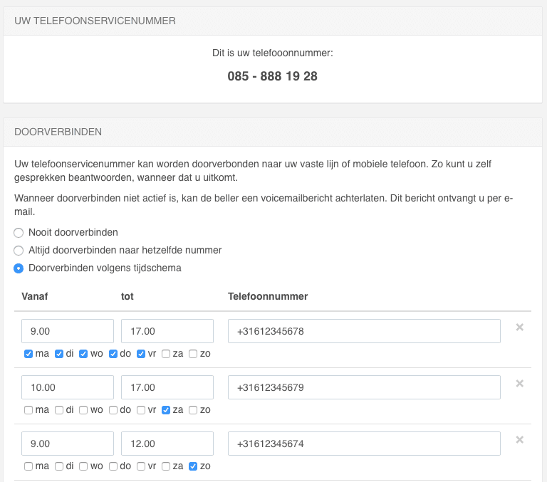 Je kunt vanaf nu zelf instellen op welke dagen en tijdstippen er doorverbonden wordt naar welk nummer. Je hebt hierin veel vrijheid. Zo kun je ervoor kiezen om in het weekend en in de avonduren de telefoon door te laten verbinden naar je mobiele nummer en op de overige momenten door te laten verbinden naar de telefoniste. [caption id="attachment_54482" align="aligncenter" width="768"]