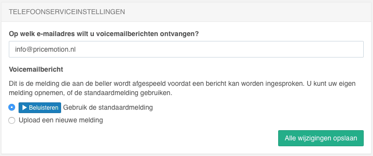 Is er niemand die de telefoon kan opnemen? Stel dan een voicemail in. Neem je eigen bericht op, of maak gebruik van onze standaard tekst. De voicemail berichten ontvang je vervolgens per e-mail, zodat je deze eenvoudig na kunt luisteren. [caption id="attachment_54483" align="aligncenter" width="763"]
