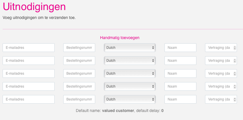 Het meegeven van een naam was al mogelijk bij de uitnodigingen die verstuurd werden op de automatische manier, c.q. voor webwinkels die onze module op de webwinkel hebben geïnstalleerd. Het grootste voordeel hiervan is dat de klant zijn naam en e-mailadres niet meer hoeft in te vullen. Deze is al bij ons bekend, dit maakt het plaatsen van een beoordeling nog laagdrempelig en eenvoudiger. Een bijkomend voordeel is dat je deze naam weer kunt gebruiken in jouw uitnodigingsemail, bijvoorbeeld om het onderwerp te personaliseren. Vanaf nu is dat ook mogelijk voor leden die de uitnodigingen handmatig versturen naar de consumenten. Zie hiervoor onderstaande afbeelding: [caption id="attachment_64049" align="aligncenter" width="845"]