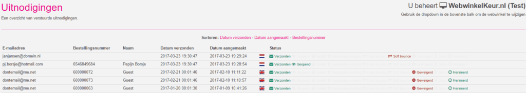 Ook in de rij van de verzonden uitnodigingen word de naam getoond van de klant wanneer dit bekend is, de meeste webwinkel software stuurt de klantnaam mee zodat de klant deze zelf niet hoeft in te vullen
