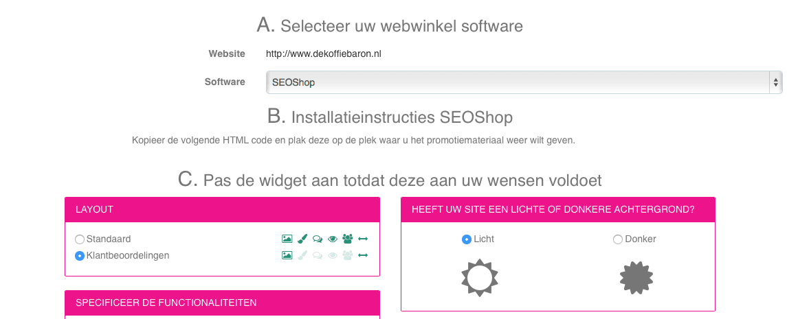 Je bent nu op de pagina waar je de nieuwe widget code kunt genereren. Volg hierbij de stappen. In de eerste stap kun je kiezen of je de standaard layout wilt gebruiken of de klantbeoordelingen layout. De klantbeoordelingen layout is gelijk aan de oude klantenscores widget. De preview hiervan zie je onderaan de pagina. Personaliseer de widget zo dat deze bij jouw eigen webwinkel past.