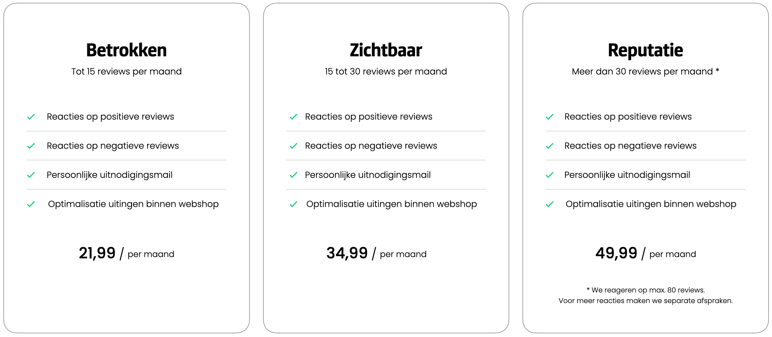Maak gebruik van onze nieuwe service tegen een introductieprijs. Kies een pakket dat past bij jouw webshop en laat ons jouw reviews verzorgen. Zo breng je jouw webwinkel naar een hoger niveau.