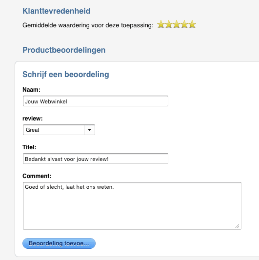 Waarom de klant zijn e-mailadres, ordernummer en naam laten invullen als hij een beoordeling plaatst als deze gegevens al bekend zijn? Bij het plaatsen van een beoordeling hoeft een klant nu enkel nog een waardering + tekst in te vullen. Hiermee wordt het plaatsen van een beoordeling nog gemakkelijker. Gmail gebruikers hoeven daarbij niet eens onze website te bezoeken . [caption id="attachment_32258" align="aligncenter" width="531"]
