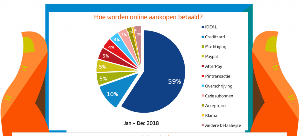 In 2018 zijn in Nederland in totaal 242 miljoen online aankopen gedaan. Daarbij werd in 59 procent van de gevallen betaald via iDEAL, al jarenlang de favoriete betaaloplossing onder Nederlandse e-shoppers. Op ruime afstand van iDEAL volgt de creditcard (10 procent) als populairste betaalmiddel om online mee te winkelen.SDD, PayPal en achteraf betalen