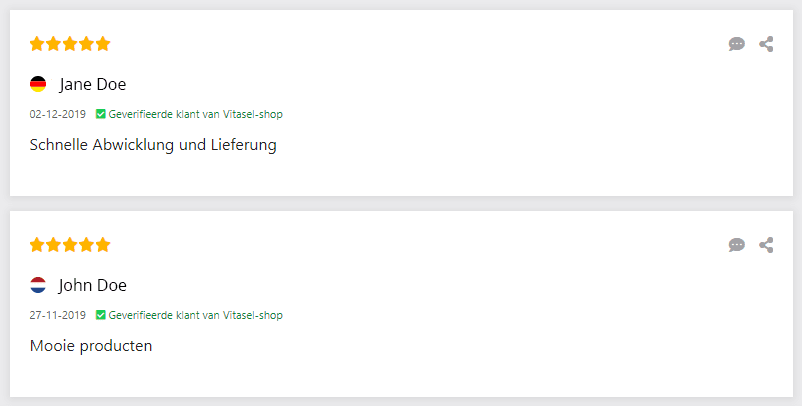 - De vlag van het vestigingsland van de webshop. Als de taal een officiële taal is in dat land. Bijvoorbeeld een review in het Duits vanuit een IP-adres in Brazilië krijgt de Duitse vlag.