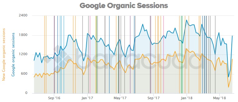 Een van de eerste dingen die je altijd moet controleren is uiteraard de aantallen in de organische bezoekers. Hiervoor zijn meerdere tools te gebruiken, om eventueel te zien vanaf wanneer een mogelijke daling is begonnen. Pro tip: gebruik de kosteloze en vrijblijvende Panguin tool om publiek bekende algoritme updates te plaatsen op een grafiek van organisch zoekverkeer van jouw website. Zo kun je gemakkelijk zien of een dip net na een Google algoritme aanpassing komt waar andere website eigenaren ook over bericht hebben. [caption id="attachment_76251" align="aligncenter" width="725"]